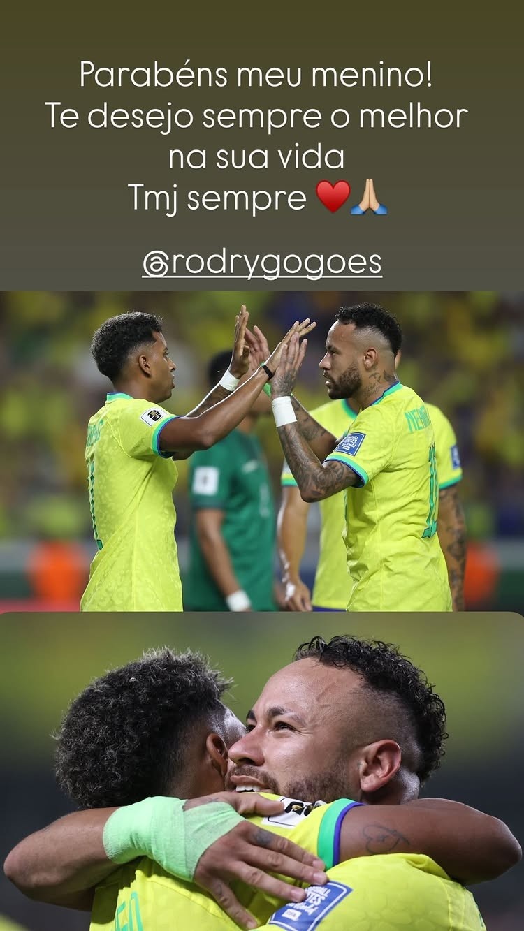 内马尔通过社媒晒出两人在巴西国家队的拥抱合照,并配文:“恭喜你,我的男孩!我永远祝你一切顺利。我们永远在一起。”